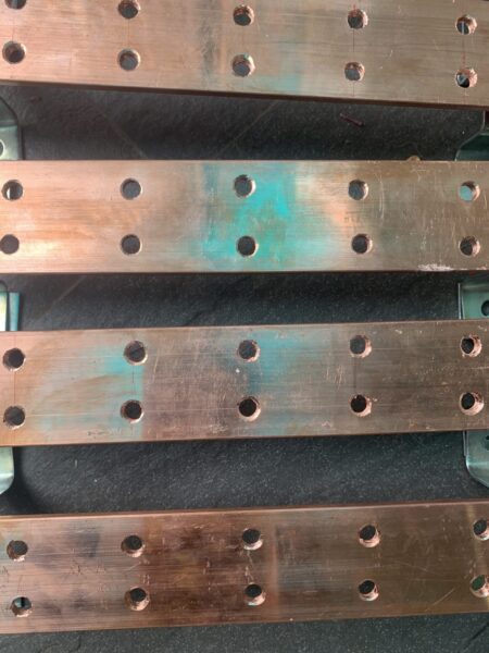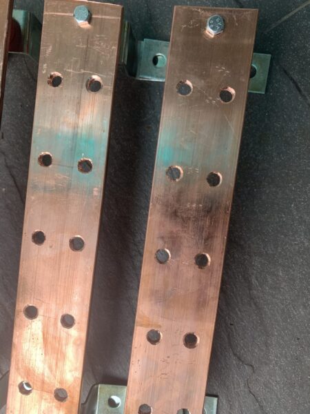 - Bảng đồng tiếp địa 300x50x5 : Thiết bị này là vật trung gian, đứng giữa 2 hệ thống: thu sét và tản sét. Về bản chất, bản đồng tiếp địa là những miếng đồng dẹt, được đục sẵn lỗ. Một đến hai lỗ sẽ được bắt dây tiếp địa, nối từ các thiết bị thu sét (hệ thống chống sét trực tiếp) hoặc cắt lọc sét (hệ thống chống sét lan truyền). Các lỗ còn lại được nối với bãi tiếp địa.